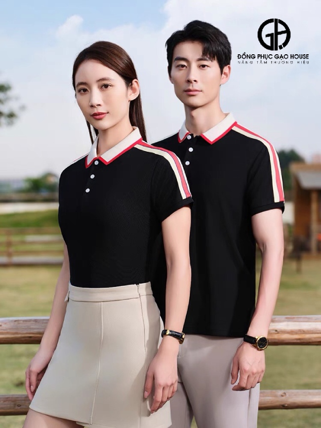 Mẫu áo đồng phục polo công ty luôn là item được các doanh nghiệp lựa chọn nhờ sở hữu thiết kế trẻ trung, thời trang và phù hợp với mọi dáng người. Mẫu áo thun đồng phục được thiết kế với tone màu đen chủ đạo, phối bo cổ trắng line đỏ độc đáo mang đến sự thu hút, chuyên nghiệp và gia tăng độ nhận diện cho thương hiệu. Đặc biệt, Gạo House còn chú trọng đến chất liệu vải may áo công ty, sử dụng vải thun Lacoste cao cấp để đem lại sự thoải mái, tự tin cho người mặc.