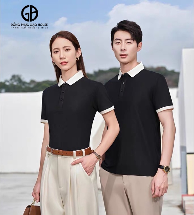 Đồng phục doanh nghiệp màu đen thường được nhiều công ty lựa chọn nhờ toát lên vẻ đẹp sang trọng và thời thượng. Trên tone nền màu đen, Gạo House đã điểm xuyến phần cổ và tay màu trắng tạo nên điểm nhấn độc đáo, thanh lịch. Form dáng áo đồng phục công ty được được may theo kiểu Regular Fit đặc trưng, ôm vừa vặn cơ thể mang lại sự thoải mái và tôn dáng người mặc.
