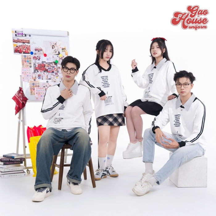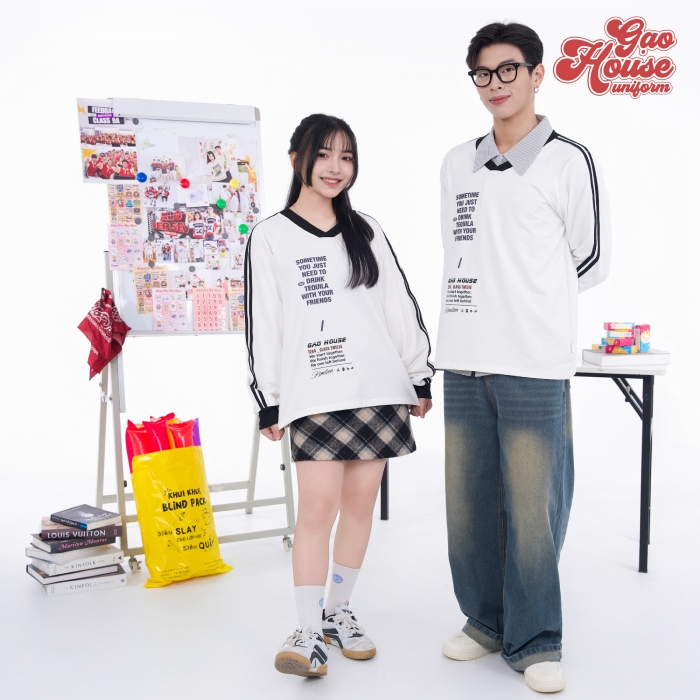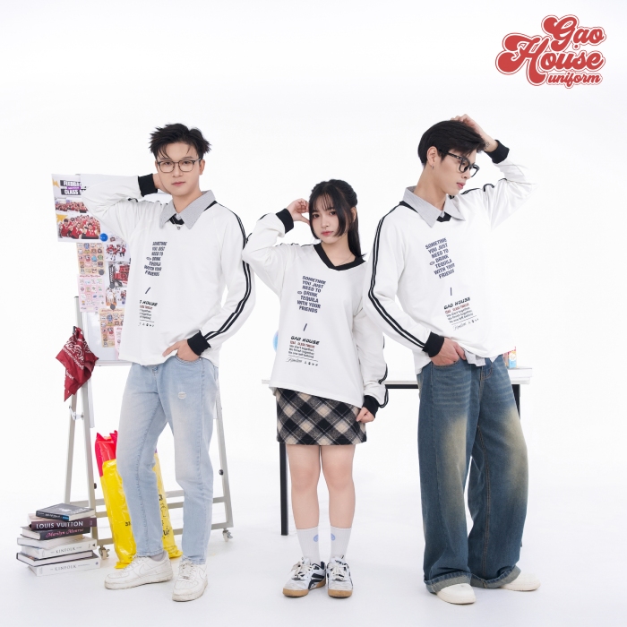 Nhằm mang đến mùa đông ấm áp và đồng bộ cho các bạn học sinh, Gạo House đã thêm vào BST áo đồng phục lớp mùa đông mẫu áo tay dài màu trắng phối line đen. Item sở hữu form dáng rộng rãi, điểm nhấn thêm đường line kẻ đen nổi bật. Hình in của áo được Gạo House sáng tạo theo yêu cầu của các bạn học sinh tạo nên “chất riêng” cho cả lớp.