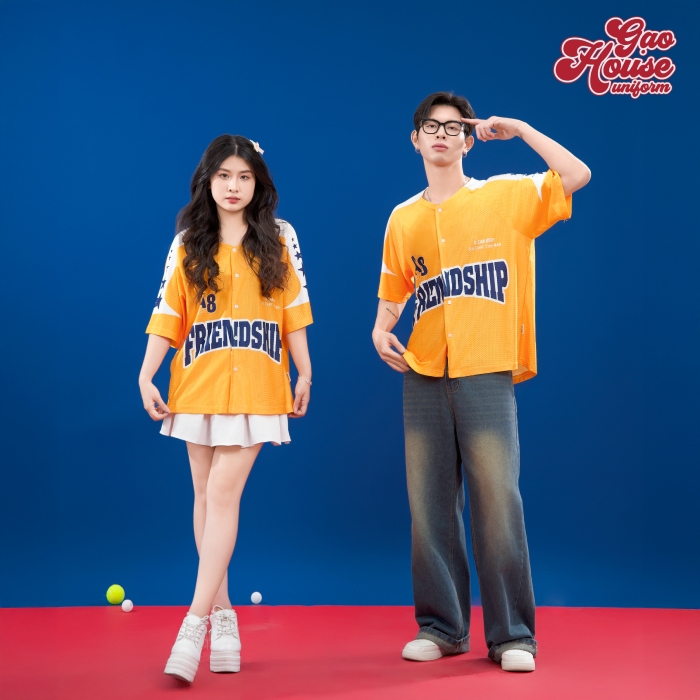 Lấy cảm hứng từ những kỷ niệm gần gũi, kí ức đẹp đẽ của tuổi học trò, pha chút nổi loạn của thế hệ học sinh hiện nay. Đồng phục Gạo House đã thêm bài BST áo lớp mẫu đồng phục sơ mi in hình 3D sắc nét, nổi bật. Item được tô điểm với tone màu vàng cam tươi mới, phối line trắng ở cầu vai tạo nên sự khác biệt. Chất liệu vải cũng được may từ vải thun mè cao cấp, tạo nên sự thoải mái, dễ chịu giúp các bạn học sinh luôn hết mình trong những hoạt động tại trường/ lớp.
