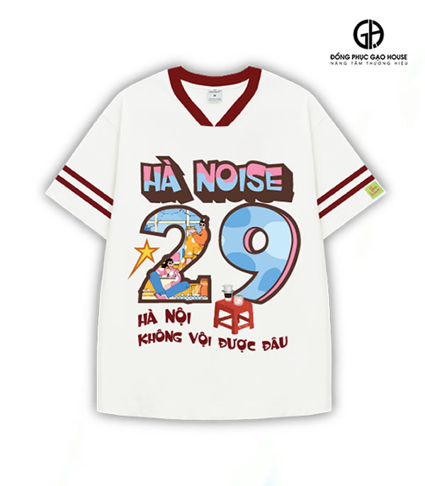 Điểm khiến mẫu áo đồng phục nhóm cổ V trắng gạo trở nên “không thể nhầm lẫn” chính là phần hình in áo nhóm nổi bật với concept “Hà Noise 29”. Đây là một lối chơi chữ thông minh, phá cách từ “Hà Nội”, mang đến dấu ấn đậm chất GenZ và tinh thần “không vội được đâu” siêu trending.