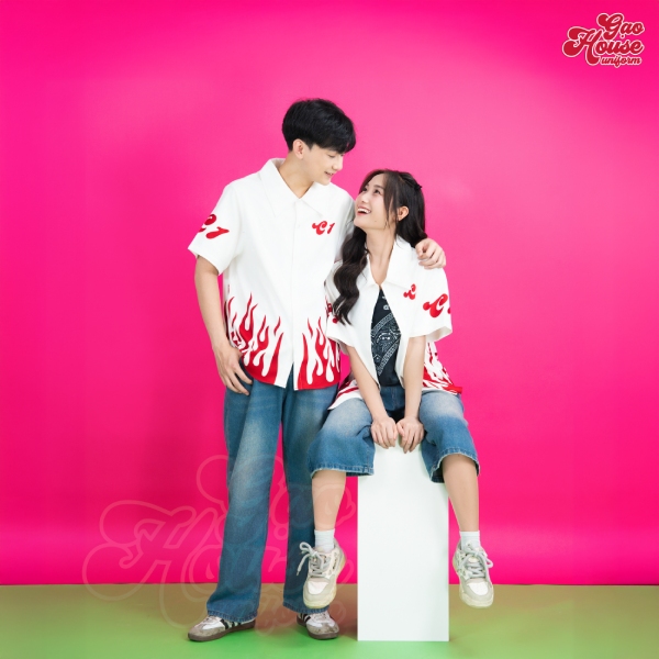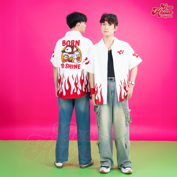 Mẫu áo lớp sơ mi đồng phục của BST Print SM chắc chắn khuấy đảo giới trẻ bởi màu sắc và hình in bùng nổ. Thiết kế áo đồng phục trắng tinh khôi, phối họa tiết lửa đỏ cực cháy ở gấu áo và tay áo. Mặt sau áo được in slogan “Born to Shine” 3D siêu ngầu, giúp cả lớp tỏa sang theo chất riêng. Đặc biệt, áo may từ vải Kate cao cấp, mềm mát, đứng form, đảm bảo thoải mái trong mọi hoạt động.