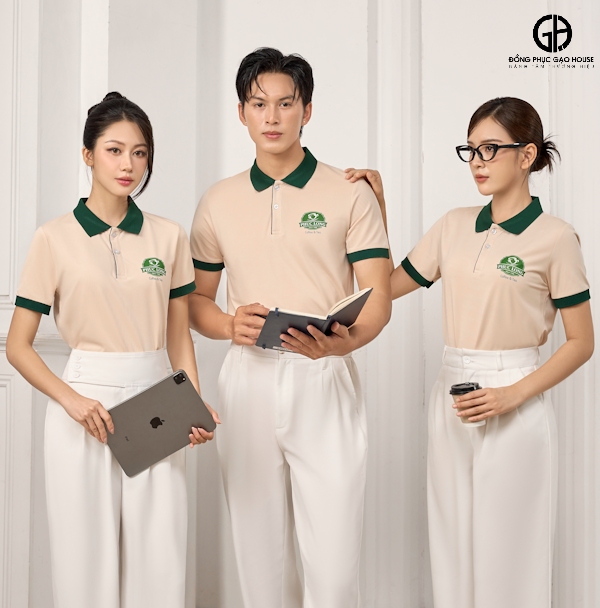 1.1. Thiết kế áo đồng phục công ty màu be phối cổ xanh lá