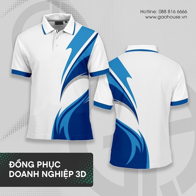 Áo Polo Doanh Nghiệp 3D Màu Trắng Phối Xanh Navy Họa Tiết Sóng