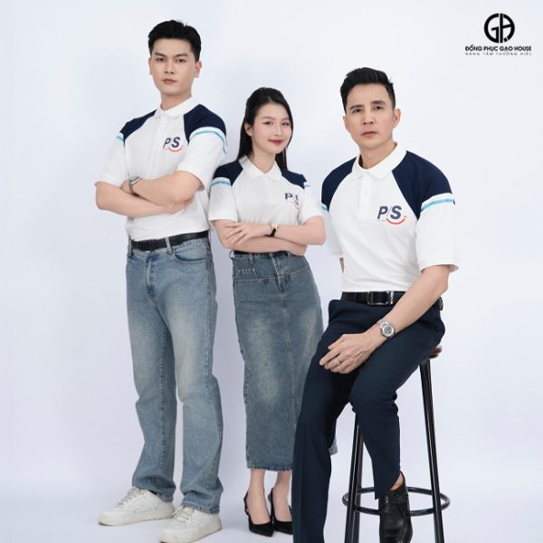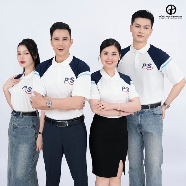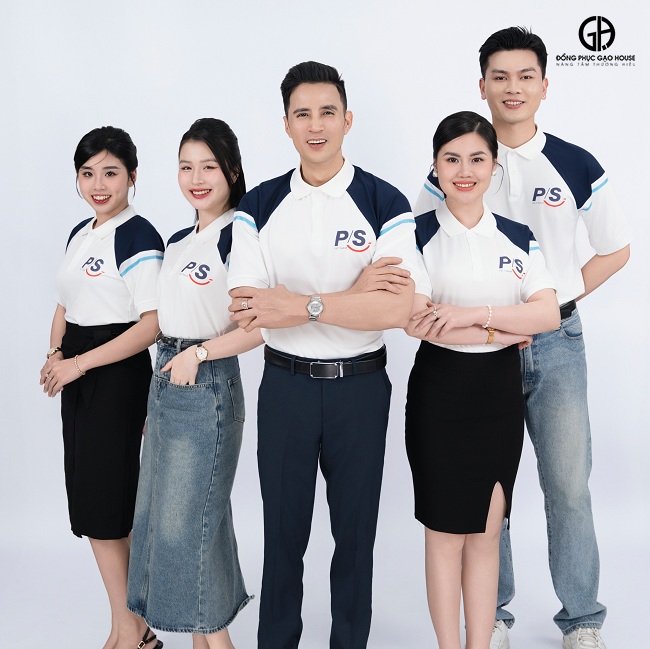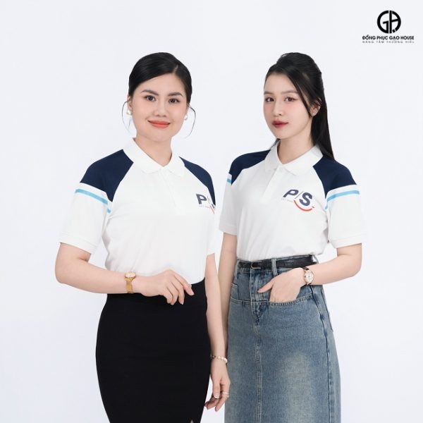 Mẫu áo thun đồng phục P/S gây ấn tượng với cách phối màu tinh tế, mang đến diện mạo chuyên nghiệp nhưng vẫn trẻ trung, năng động. Gam trắng chủ đạo giúp tổng thể trang phục trở nên thanh lịch, nhã nhặn, đồng thời tạo cảm giác sạch sẽ, gọn gàng. Điểm nhấn nổi bật nằm ở phần phối màu xanh đen trên cầu vai, kéo dài xuống nửa phần tay áo, tạo hiệu ứng mạnh mẽ, giúp bờ vai trông rộng và vững chãi hơn.