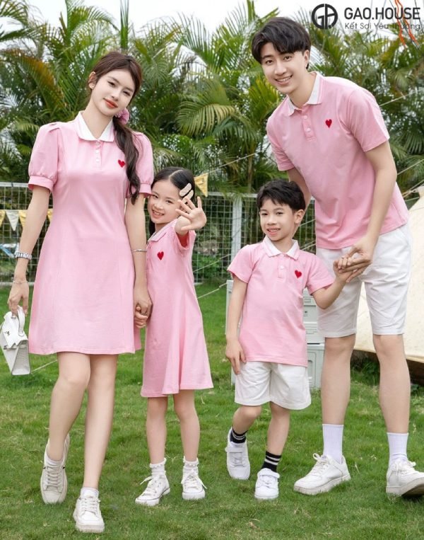 Áo váy đồng phục gia đình màu hồng in trái tim là một trong những phong cách thời trang đẹp, phá cách và bán chạy hàng đầu tại xưởng Gạo House. Mẫu váy được thiết kế dáng xòe, kết hợp cùng phong cách polo cổ bẻ vừa có thể mang đến điểm nhấn, vừa tạo nên sức hút trọn vẹn cho người mặc. Đặc biệt, trên ngực trái áo còn được Gạo House in hình trái tim màu đỏ nhằm thể hiện tình cảm yêu thương của gia đình dành cho nhau.