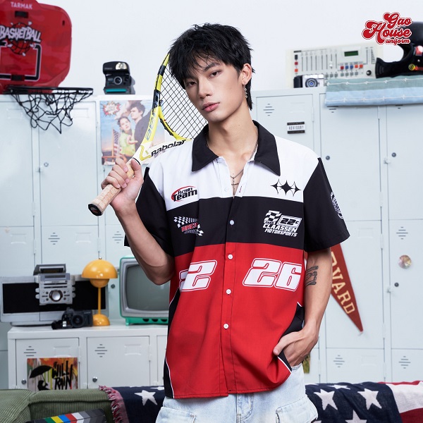 - Họa tiết: Hoạ tiết trên áo mang đậm phong cách racing – bóng chày, với các con số in to bản ở thân áo theo kiểu typography của áo đua xe, kết hợp cùng những logo và icon nhỏ trước ngực như các patch trang trí, tạo nên vẻ ngoài ấn tượng.
