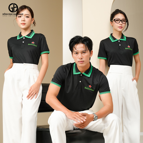 Gam màu của mẫu áo đồng phục công ty Heineken mang lại ấn tượng mạnh ngay từ cái nhìn đầu tiên. Tone đen chủ đạo mang lại cảm giác sang trọng, và dễ phối đồ trong mọi hoàn cảnh. Không quá phô trương nhưng vẫn cuốn hút, sắc đen giúp tổng thể chiếc áo luôn bền dáng và giữ được tính thẩm mỹ lâu dài.