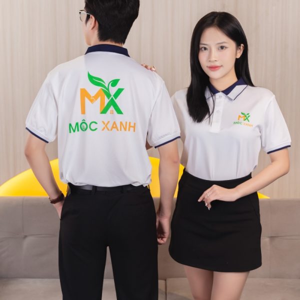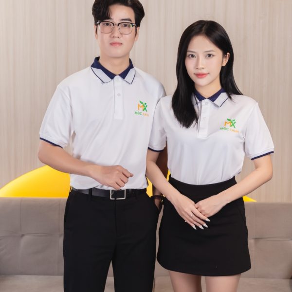 Doanh nghiệp hiện nay hầu hết sẽ chú trọng đến hình ảnh thương hiệu, vì thế quy chuẩn về đồng phục là không thể thiếu. Mẫu áo thun đồng phục trắng phối cổ bo dệt xanh than được thiết kế tinh giản nhưng đầy “dụng ý”, tạo nên sự khác biệt rõ nét cho doanh nghiệp.