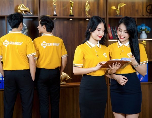 Vàng là tone màu chủ đạo của mẫu áo đồng phục Sun Group – gắn liền với thương hiệu của doanh nghiệp. Giống như ánh nắng mặt trời, màu vàng mang đến cảm giác ấm áp, gần gũi, tạo dựng mối quan hệ thân thiện giữa tất cả nhân viên và cả đối tác/ khách hàng.