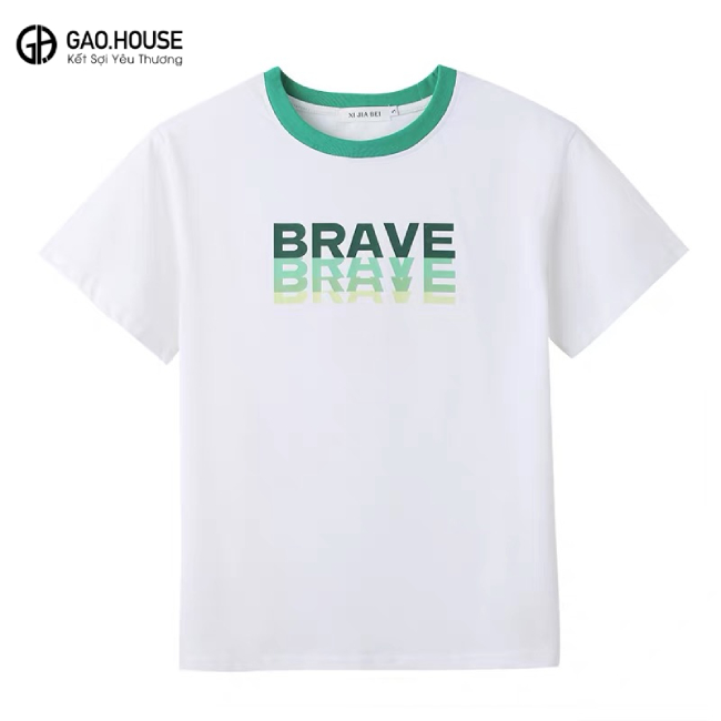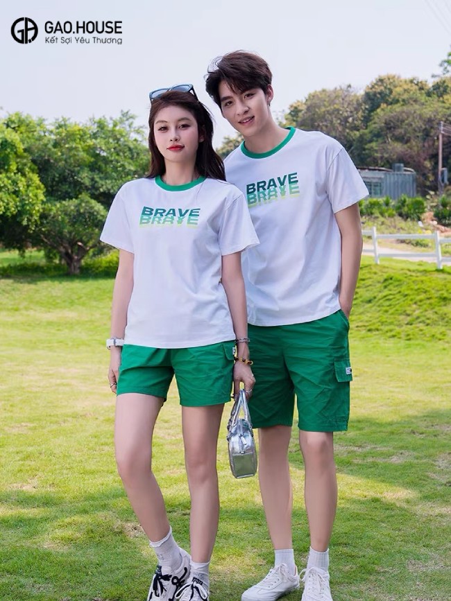 Phần cổ áo phông gia đình may bo dệt rib co giãn 1×1, ôm nhẹ nhưng không hề gây bí hay khó chịu. Màu xanh lá của phần bo cổ và viền tay được phối ăn ý với quần short đồng màu, mang đến cảm giác hài hòa, tươi tắn. Dòng chữ “BRAVE” in giữa ngực sử dụng kỹ thuật in áo đồng phục 3D, có độ sắc nét cao và bám màu tốt, giúp tổng thể thêm phần nổi bật khi lên hình.
