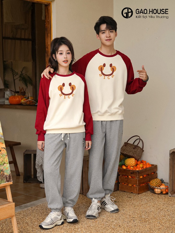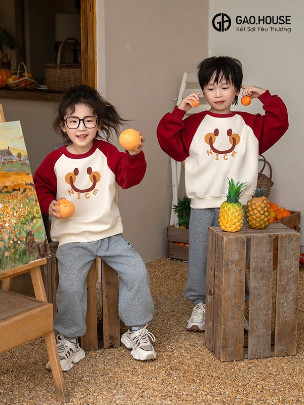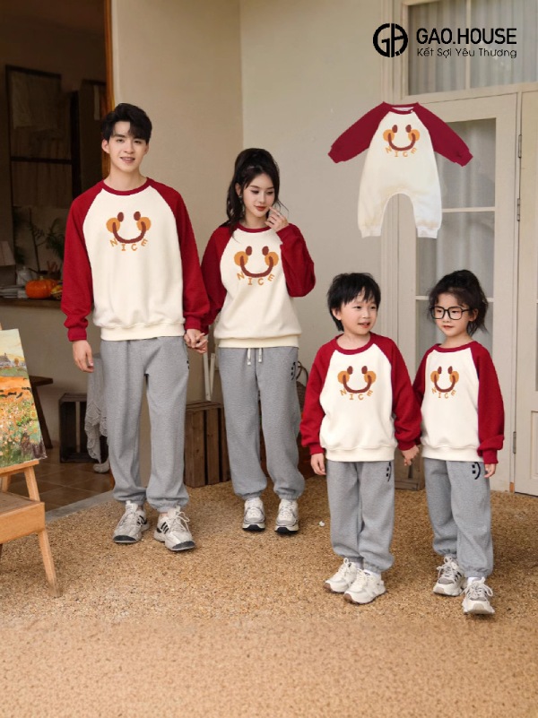 Xu hướng thời trang mùa đông năm nay gọi tên “Áo gia đình mùa đông màu đỏ”. Để mẫu áo thêm phần nổi bật hơn Gạo House đã phối thêm tone trắng ở thân áo, để phần cổ và viền tay áo màu đỏ thu hút, độc đáo. Sự kết hợp hài hòa giữa màu đỏ tươi tắn và màu trắng tinh khôi tạo nên một tổng thể vừa nổi bật lại vô cùng thanh lịch. Ngoài ra, trên ngực áo còn được tô điểm với hình mặt cười dễ thương, tạo vẻ đẹp ngộ nghĩnh, đáng yêu giúp cả nhà luôn vui vẻ.