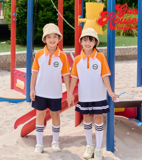 Mẫu áo đồng phục mầm non đẹp phối trắng – cam tại Gạo House đáp ứng được các tiêu chí: Tối giản – thanh lịch và phù hợp với lứa tuổi của các bé. Gạo House sử dụng sắc trắng làm tone màu chính, phối màu cam ở thân trên tạo ra vẻ đẹp hài hòa, độc đáo. Ngay trên ngực trái của áo còn được tô điểm bởi logo gắn liền với tên lớp, tên trường,… nhằm gia tăng vẻ đẹp riêng. Áo được thiết kế với form dáng cổ bẻ, phối line trắng hài hòa, giúp các bé tự tin phối đồ khi đến trường.