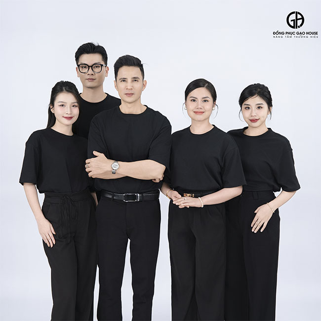 Mẫu đồng phục áo thun cổ tròn màu đen được đánh giá cao nhờ chất liệu vải cao cấp. Gạo House sử dụng dòng vải cotton pha theo tỷ lệ tối ưu, mang lại cảm giác mềm mại, thoáng khí, giúp nhân viên luôn thoải mái ngay cả khi làm việc trong thời gian dài.